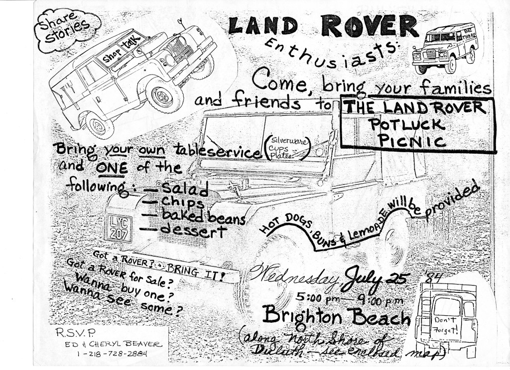 The first gathering of Land Rover owners in Minnesota was on Wednesday, July 25th 1984 at Brighton Beach in Duluth Minnesota. Attendees were Ed Beaver, Bill Osterhiem and Andy Goldfine. All vehicles were series Land Rovers